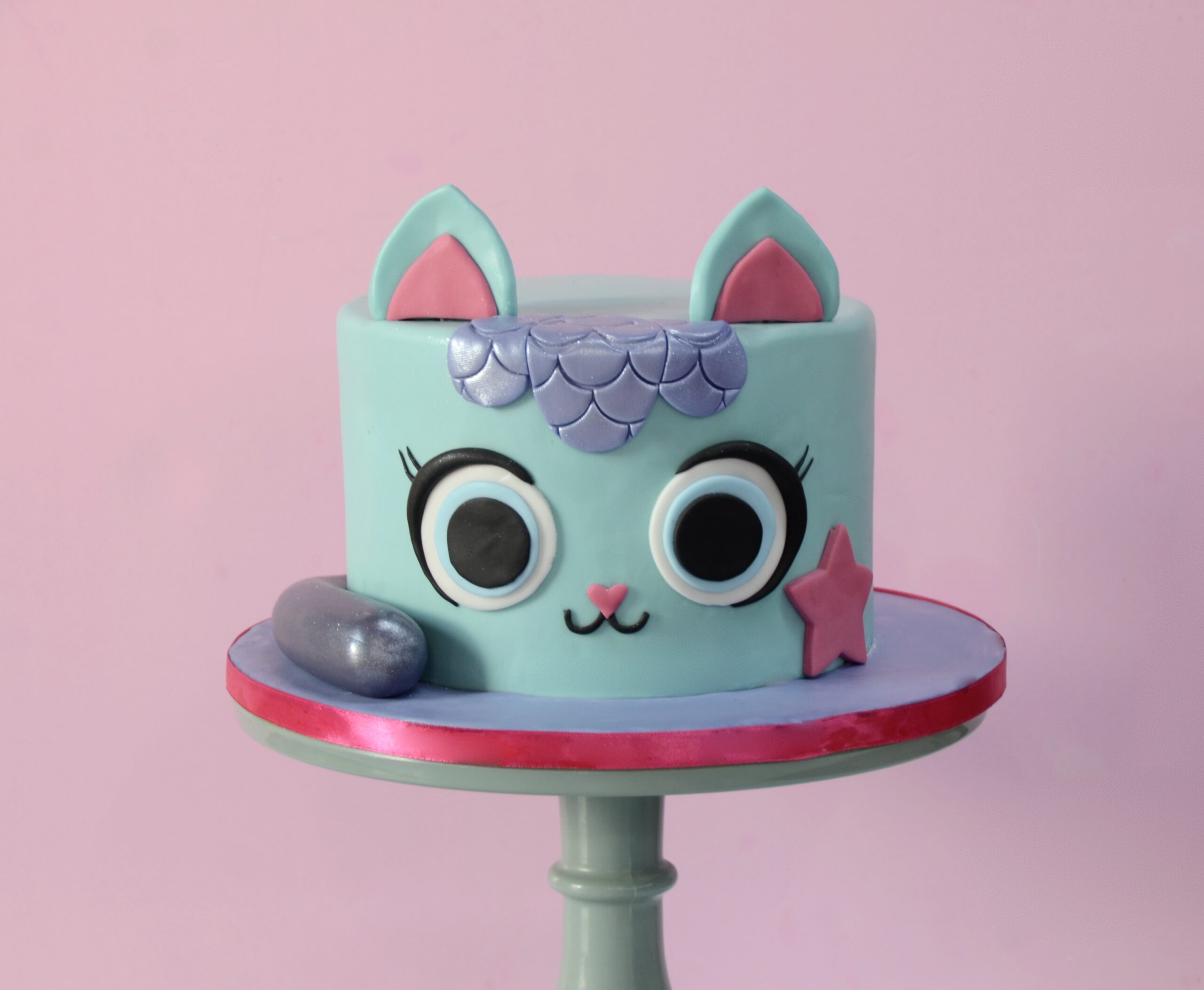 De taart heeft een witte basis, word afgewerkt met groene vegen, een groene chocolade drip en toefjes